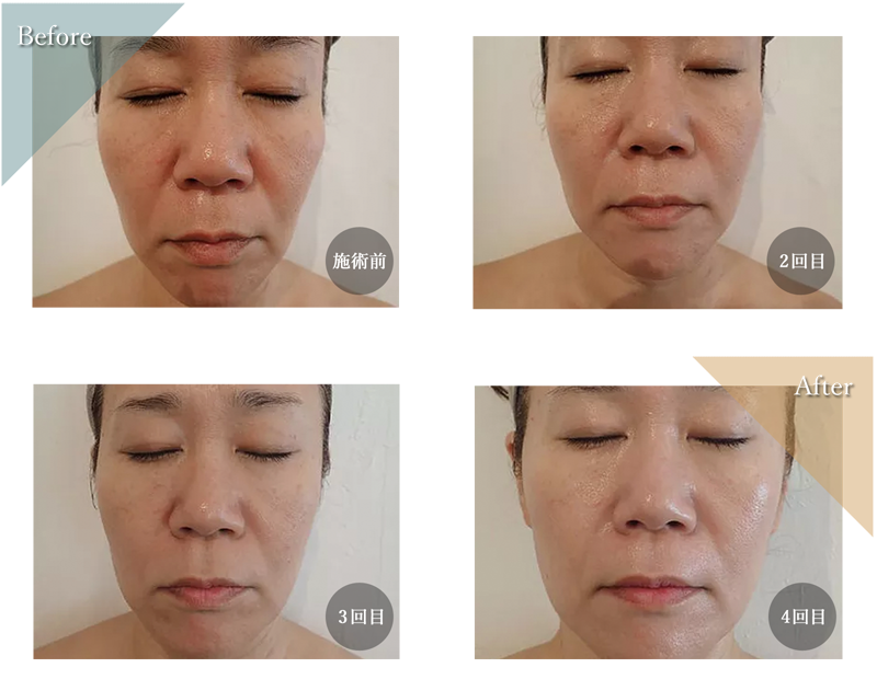 4回施術後シワ、たるみ、シミなどの肌老化を短期間で改善!ハリと透明感のあるマイナス10歳肌にへ